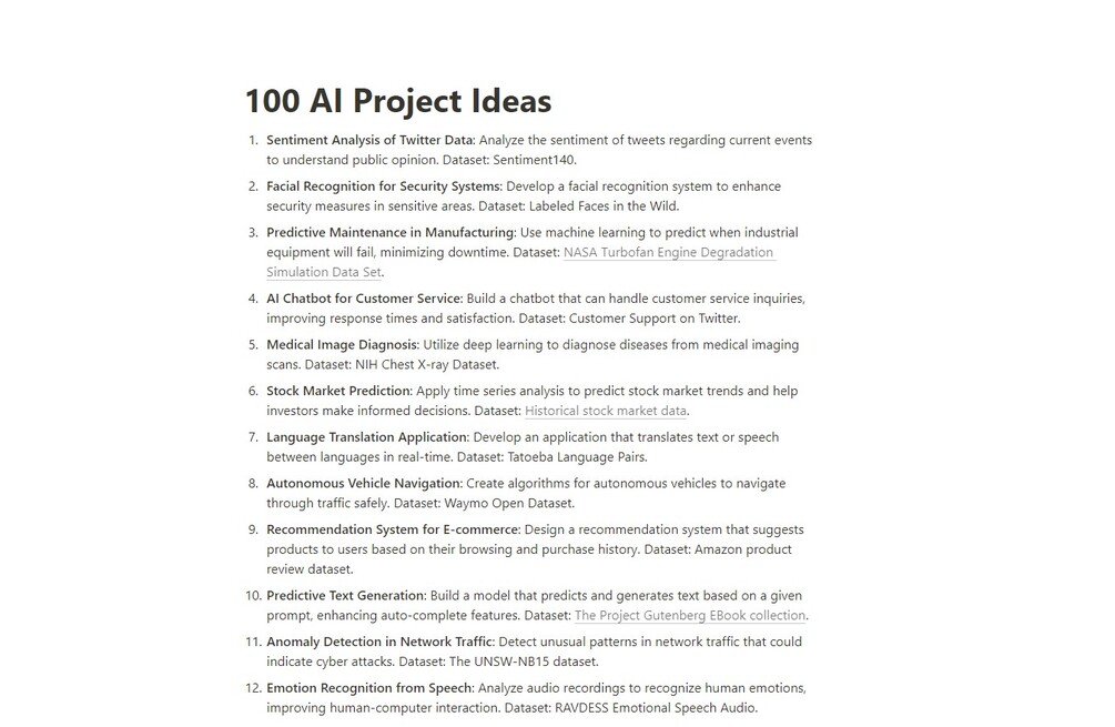 I created a list of 100 beginner-friendly ideas for AI enthusiasts. You can find the description of each project and link to the suitable dataset you can use for it. You don't have to use these projects with exactly recommended datasets, you can use any other dataset you find more suitable.
